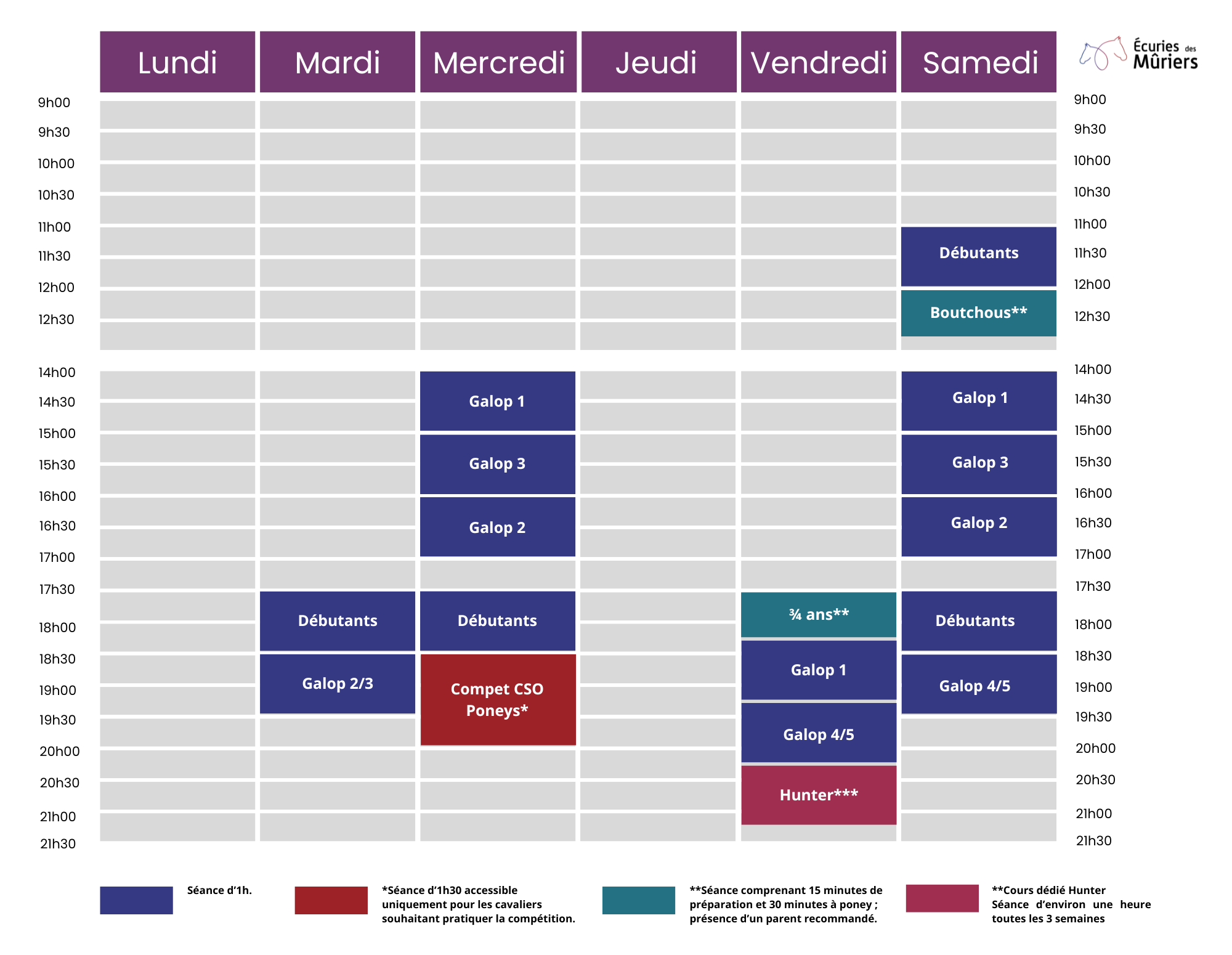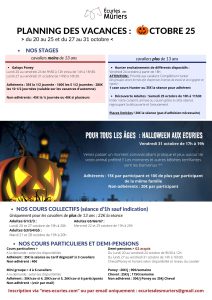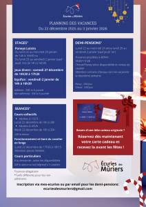 Lors des périodes de vacances scolaires, les Ecuries des Mûriers réalisent de nombreux stages ou séances spécifiques permettant à tous les niveaux de continuer à pratiquer !